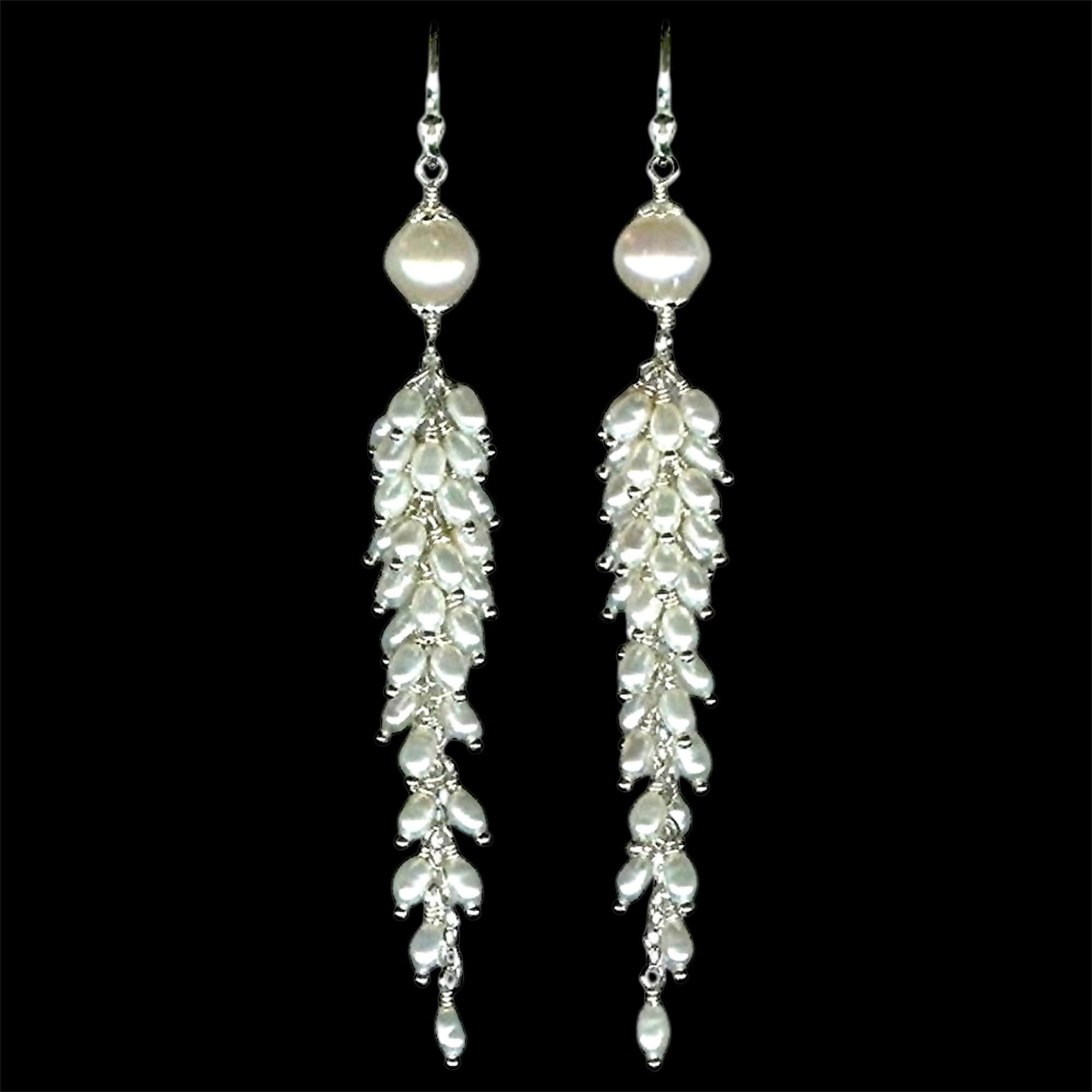 Dozens of lustrous white “rice pearls” are strung on ball-ended sterling headpins, then hand wrapped to sterling chain to form a long taper. The luxe earrings are topped with glowing off-round pearls (approx. 9-10mm) enhanced with tiny sterling silver bead caps, then hung from sterling fishhook earwires. Please note that freshwater pearls have naturally occurring surface marks that are part of the beauty of each bead.